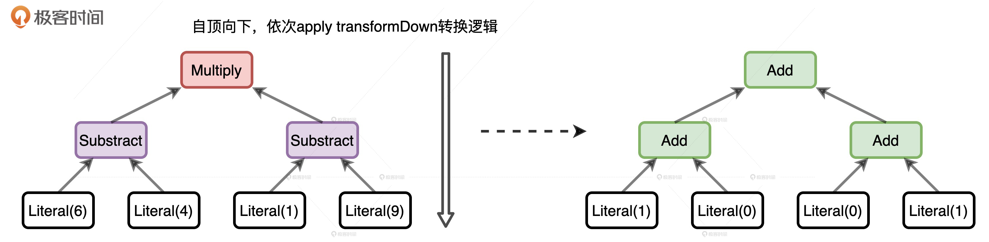 为了把复杂问题简单化,我们使用Expression,也就是表达式来解释一下这个过程。因为Expression本身也继承自TreeNode,所以明白了这个例子,TreeNode之间的转换我们也就清楚了。