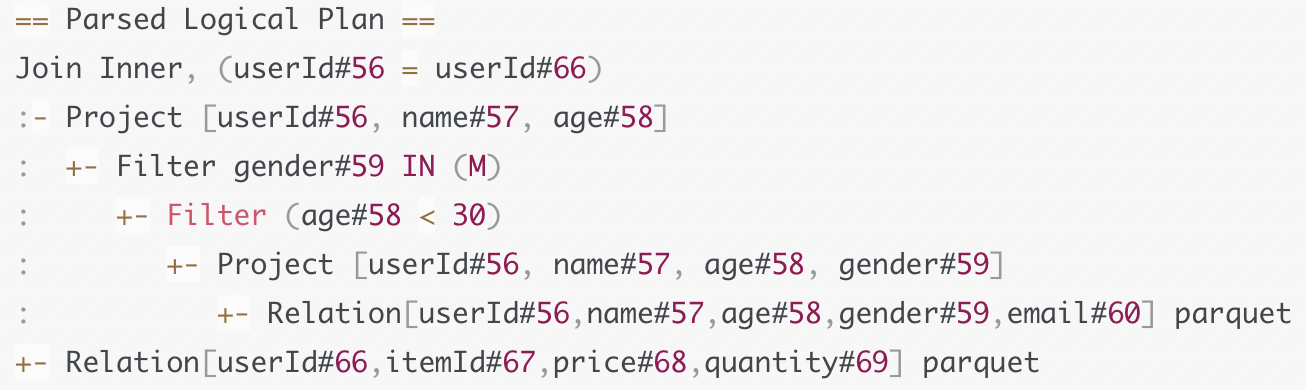 最终,被Catalyst优化过后的小Q,就从“Analyzed Logical Plan”转换为“Optimized Logical Plan”,如下图所示。我们可以看到,谓词下推和列剪裁都体现到了Optimized Logical Plan中。