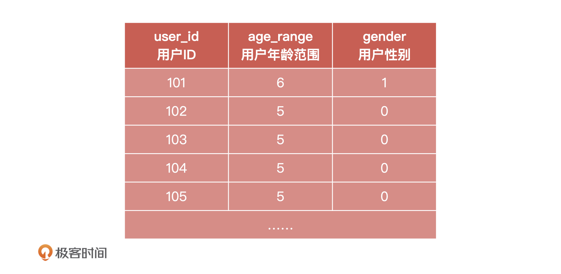 然后,我们来看用户属性特征样例表(用户画像信息)。