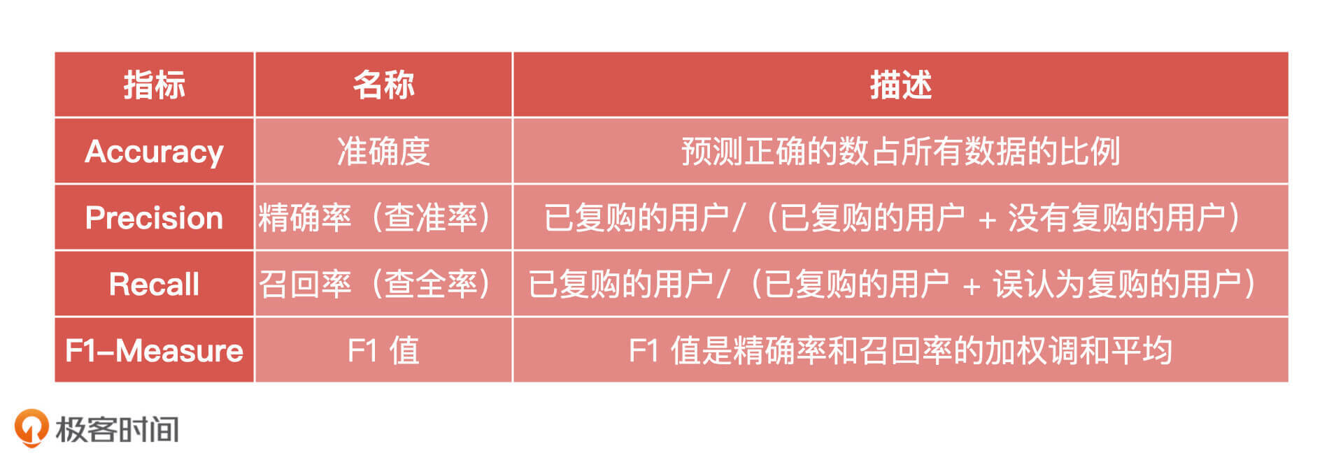 对于算法的选型,我们可以选择之前课程中学习的算法,如逻辑回归、K 近邻、决策树、随机森林等等。每一个算法都可以训练出一个 数学公式: $ x $(样本)到 数学公式: $ y $(标签)的函数,然后在使用的过程中,我们只需要通过这个函数导入一个未知的 数学公式: $ x $,就可以预测出对应的 数学公式: $ y $ 标签的概率,然后我们再将概率大于 0.5 (如果要求更高的复购概率可以提高 y 值)的 数学公式: $ y $ 值表示成复购,将概率小于 0.5 的 数学公式: $ y $ 值表示成不复购。