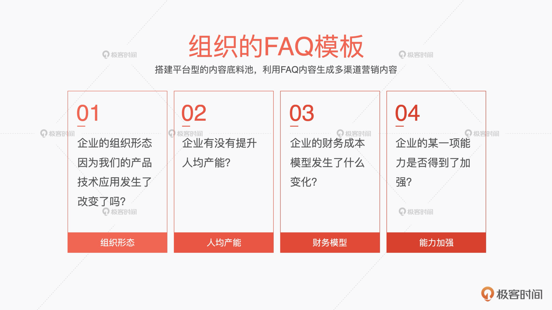 我搭内容底料池的方法,是在以前做记者时候留下的,那就是写一个自问自答的FAQ。这种方式可以定义用户场景,描述用户体验、产品价值和主要功能。同时,我们也可以直接利用FAQ内容生成多渠道营销内容。