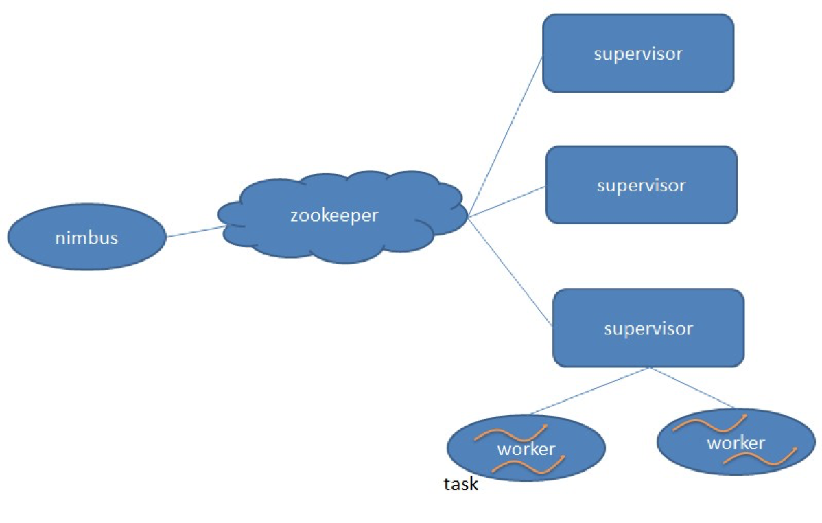 nimbus是集群的Master,负责集群管理、任务分配等。supervisor是Slave,是真正完成计算的地方,每个supervisor启动多个worker进程,每个worker上运行多个task,而task就是spout或者bolt。supervisor和nimbus通过ZooKeeper完成任务分配、心跳检测等操作。
