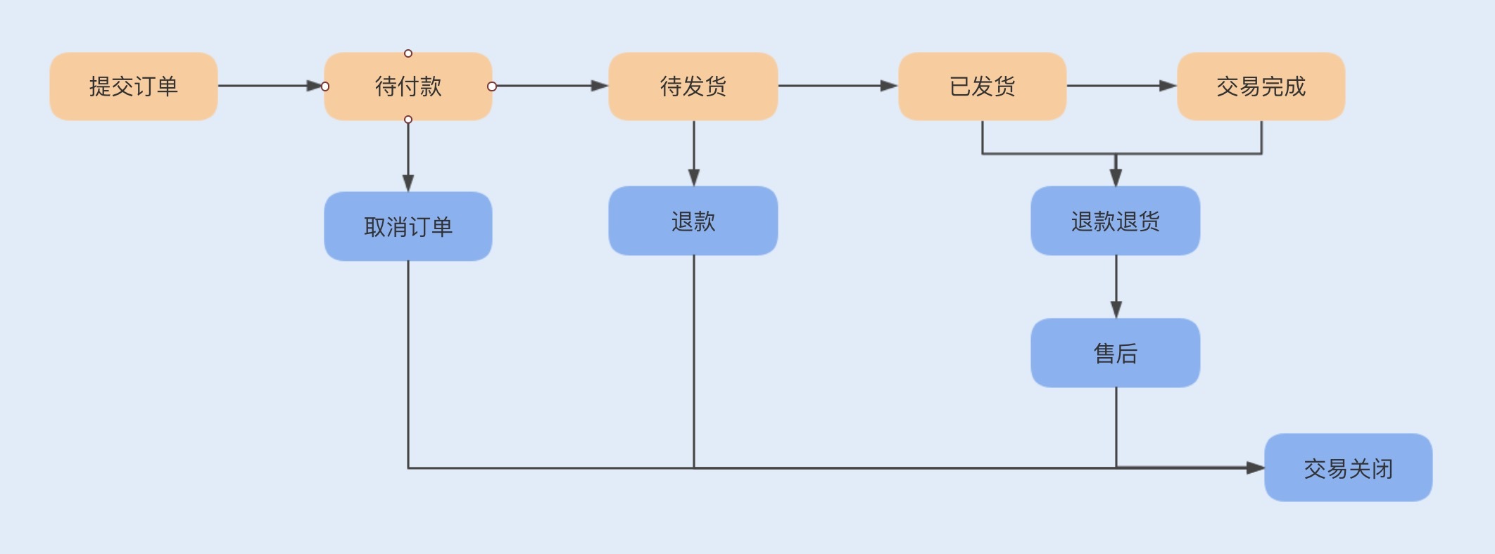 通常一个订单分为以下几个状态:待付款、待发货、待收货、待评价、交易完成、用户取消、仅退款、退货退款状态。一个订单的流程见下图: