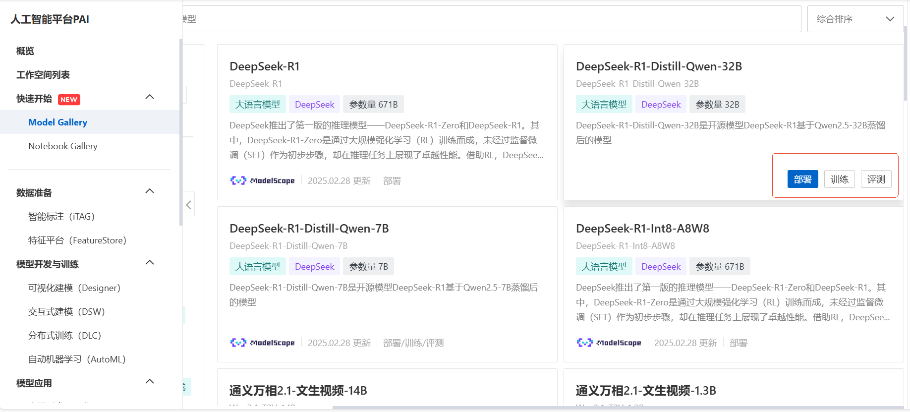 第二种是云厂商做的一些模型在线部署、微调平台。比如阿里云的 PAI 平台的模型广场功能,就具备模型的部署和训练功能。这种模式我们只需要租用云厂商的 GPU 算力即可。这些模型部署训练功能都是云厂商为了卖卡而推出的增值服务。