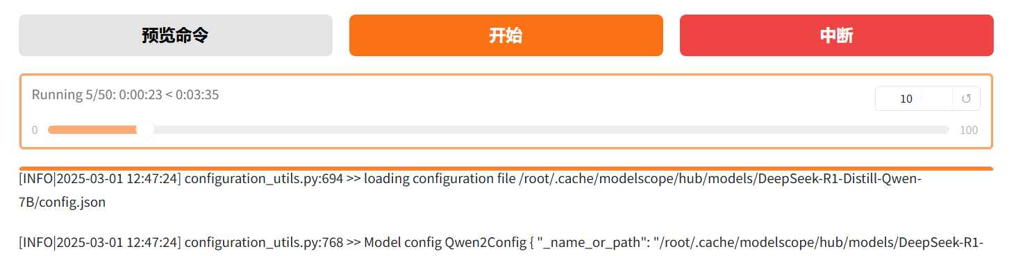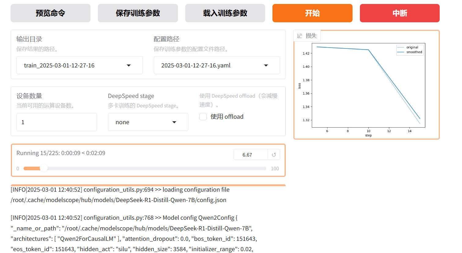 设置完成后,点击开始,就会开始训练。下方会输出训练日志以及进度。