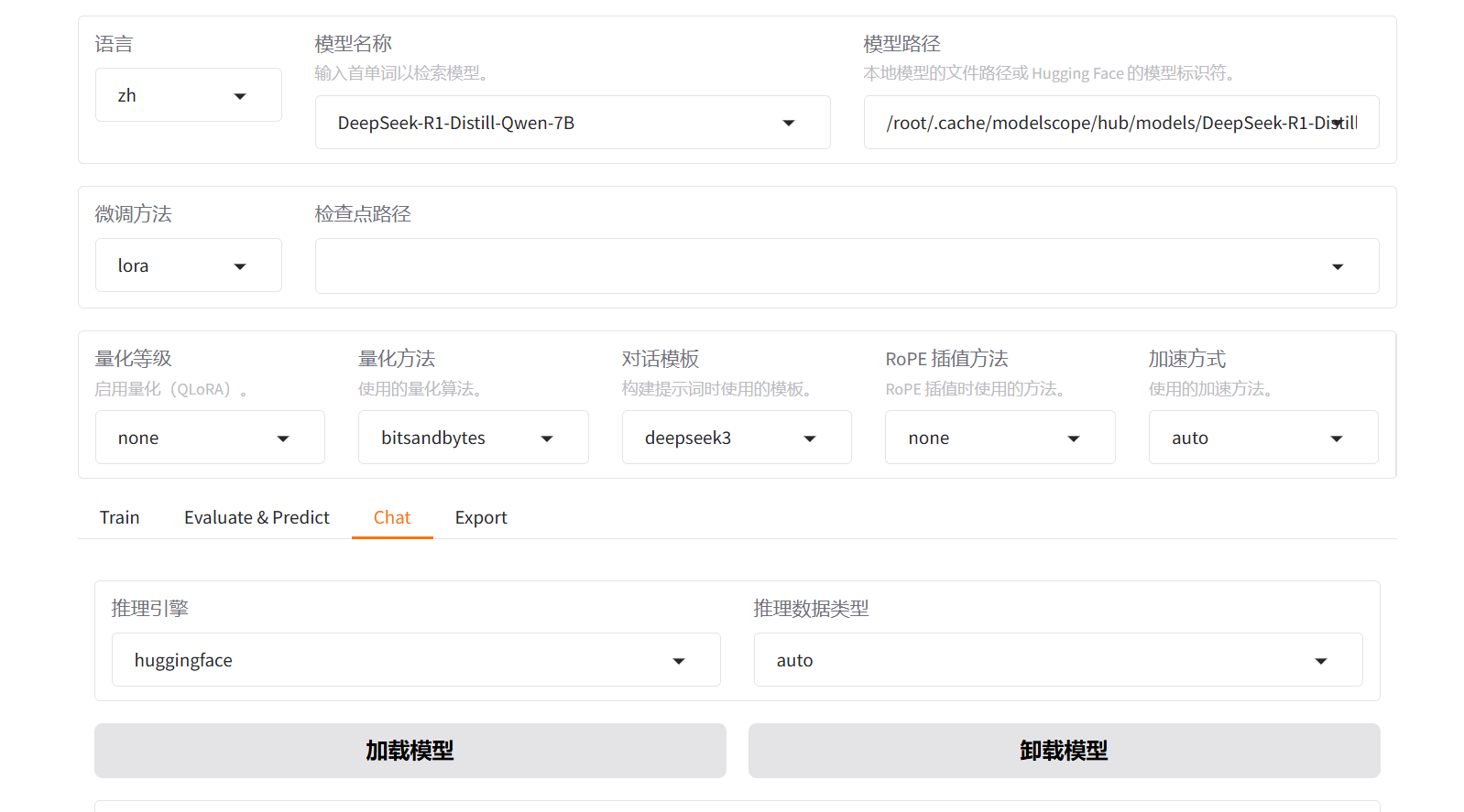 该页面展示了控制台的总体布局,该布局主要分为上下两个部分。上半部分可视为总体设置区域,涵盖了语言设置、模型选择、微调方法、量化参数、对话模板以及加速方式等内容。下半部分则由具体的功能菜单组成,分别为:训练(Train)、评估与预测(Evaluate & Predict)、对话(Chat)及导出(Export)四个功能模块。
