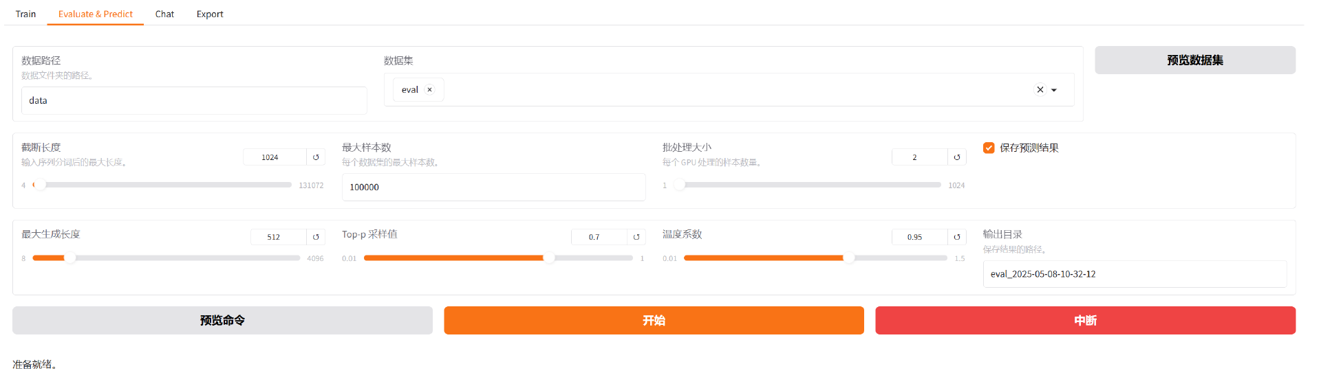 选择 Evaluate&Predict 页面,数据集选择 eval,点击开始。
