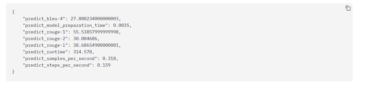 我们主要关注其中的 predict_rouge-1 的得分,这个分越高,说明生成质量越好。此次评估得分是 55.53 分,说明生成的文本与参考文本在单词级别上有约 55.53% 的重合。