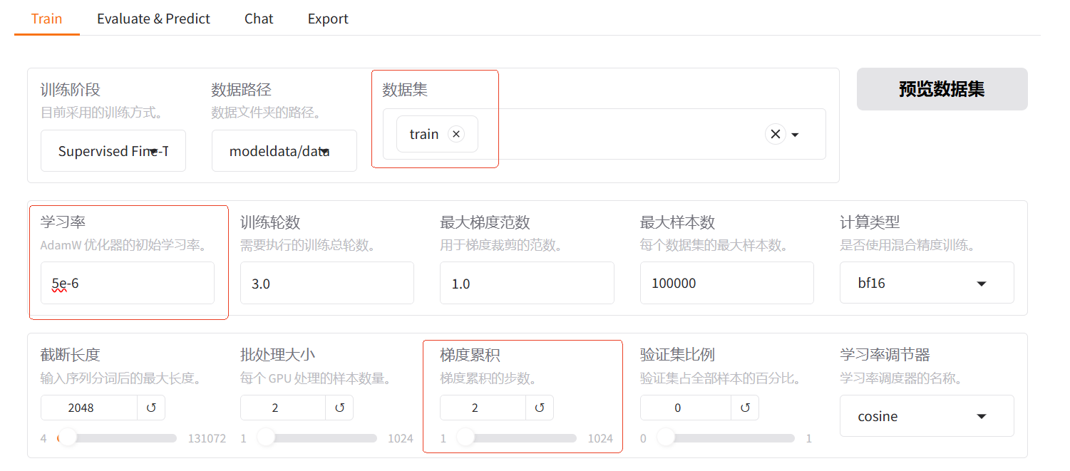 首先如下图所示,选择数据集,并设置学习率为 5e-6,梯度累积为 2,有利于模型拟合。