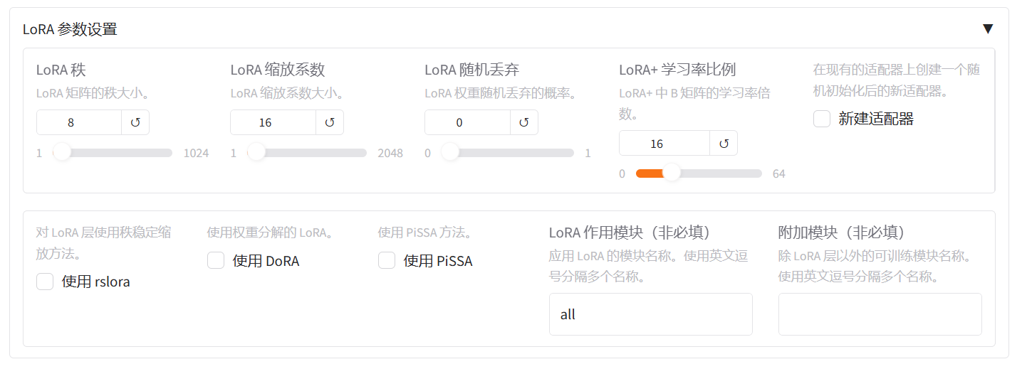 之后进行 LoRA 参数设置,我设置 LoRA+ 学习率比例为 16,LoRA+ 被证明是比 LoRA 学习效果更好的算法。在 LoRA 作用模块填 all,意思是将 LoRA 层挂载到模型的所有线性层上,提高拟合效果。
