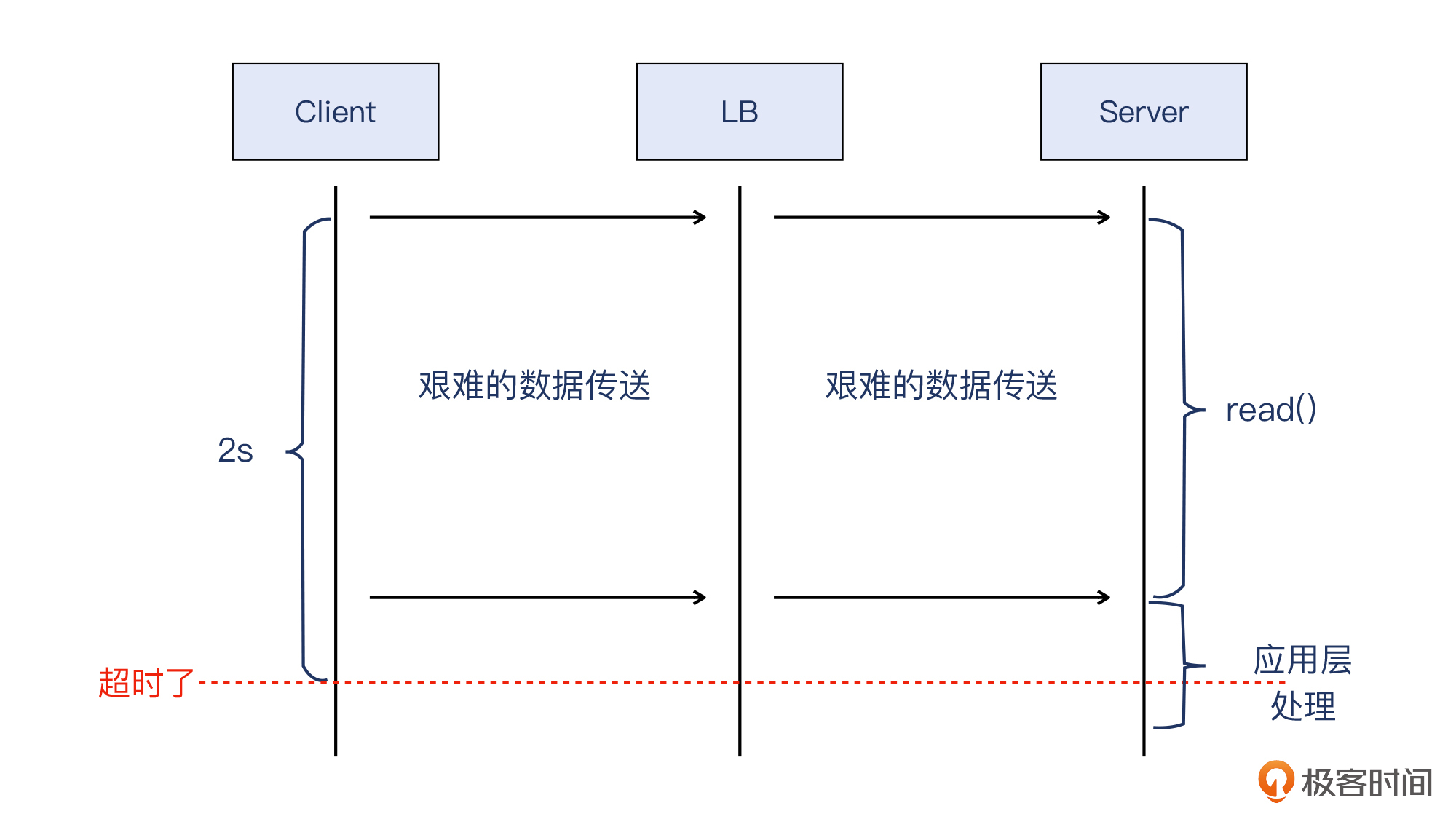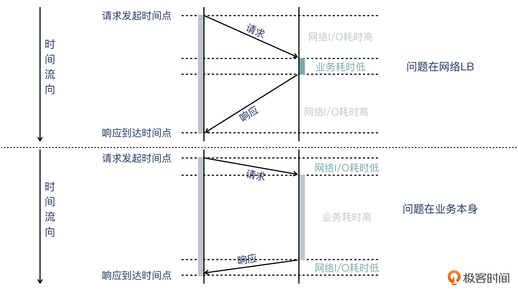 - **对于“超时、处理慢”这类问题,建议你对比客户端和服务端的耗时,这有利于你找到正确的排查方向。**在这个案例中,我们比较了两端的耗时,发现两者接近;然后,通过在服务器上做系统排查,发现时间主要花费在read()上,这就说明,问题很可能出在网络或者LB上。课程中我给你整理了一段伪代码,梳理了这种排查思路,你可以拿来参考。