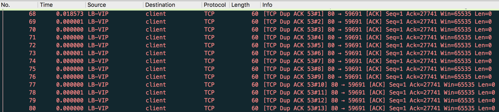 而这里出现几十次DupAck的原因是,一旦LB认为某个数据包我没有收到(此处是序列号为27741的数据包),那么数据就“断档”了,之后客户端送过来的每个数据包,LB都无法ACK这些数据包的序列号+TCP载荷字节数。所以虽然ACK包还是要发,但确认号却只能“停留”在丢包处的确认号,并且这样重复的ACK会有很多个。
