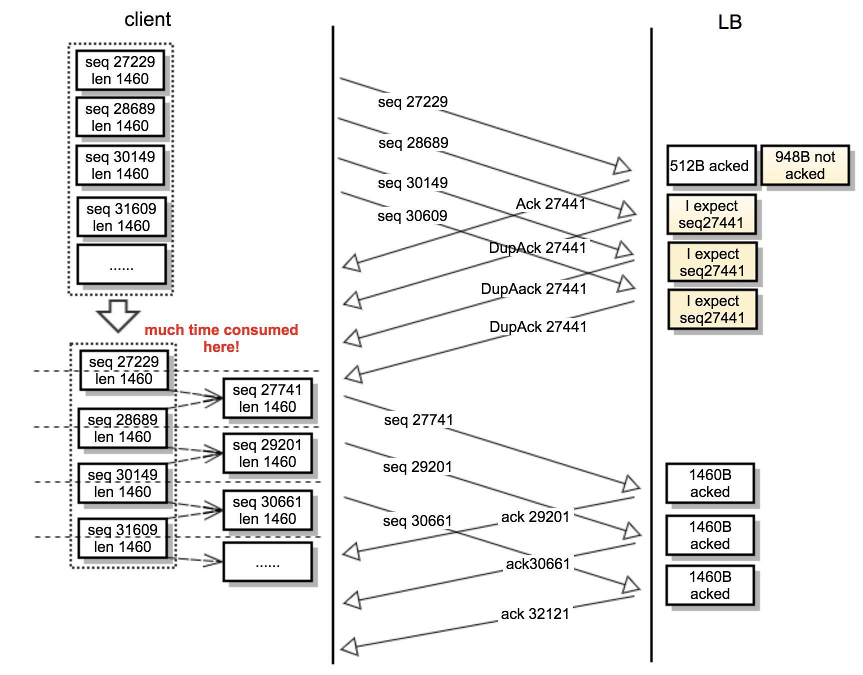 - 第六阶段:在27KB之后,LB连续发送数十个DupAck,然后客户端发送一次TCP fast retransmission;这样的情况持续到客户端把所有应该发的数据包都发完。