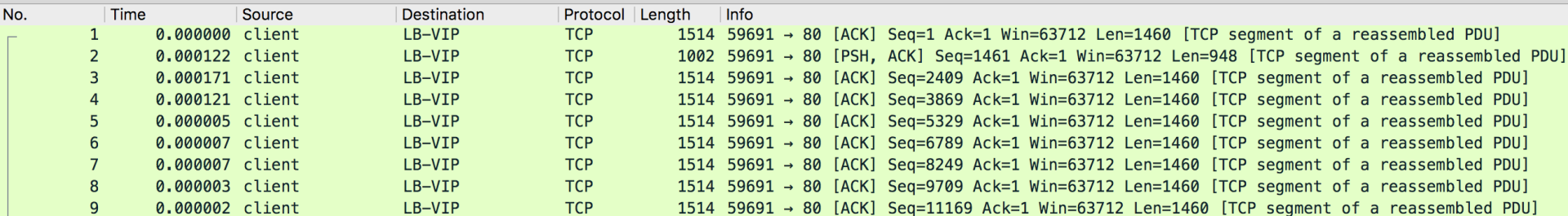 首先,我们在LB进行了抓包,用Wireshark打开抓包文件,一开始看到的是一帆风顺,全绿: