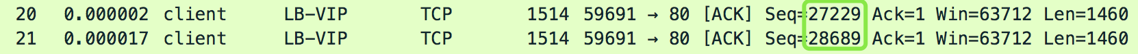 - 大约在客户端发送数据到30KB左右时,LB回复的ACK包确认的数据,不再是数据包分界点的字节数,而是位于中间的某个字节数(这个行为比较罕见)。