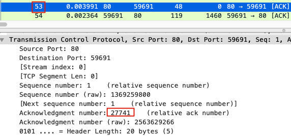 这个包是从客户端发给LB的,它的序列号为27229,载荷为1460字节。Wireshark也告诉我们,客户端将要发的下一个包的序列号会是28689。然而,LB回复的ACK(后续同样的ACK就是DupAck)却是这样: