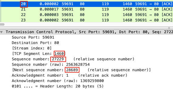 如果TCP也可以这样呢?那么,**“寻找序列号为27741的包”也许就是个伪命题,这个“包”实际上并不是独立的一个包,它只是某一个TCP包的一部分(前半部分)。**我们来看一下包号20(也就是前面找27741的时候,关注的两个报文之一)的详情: