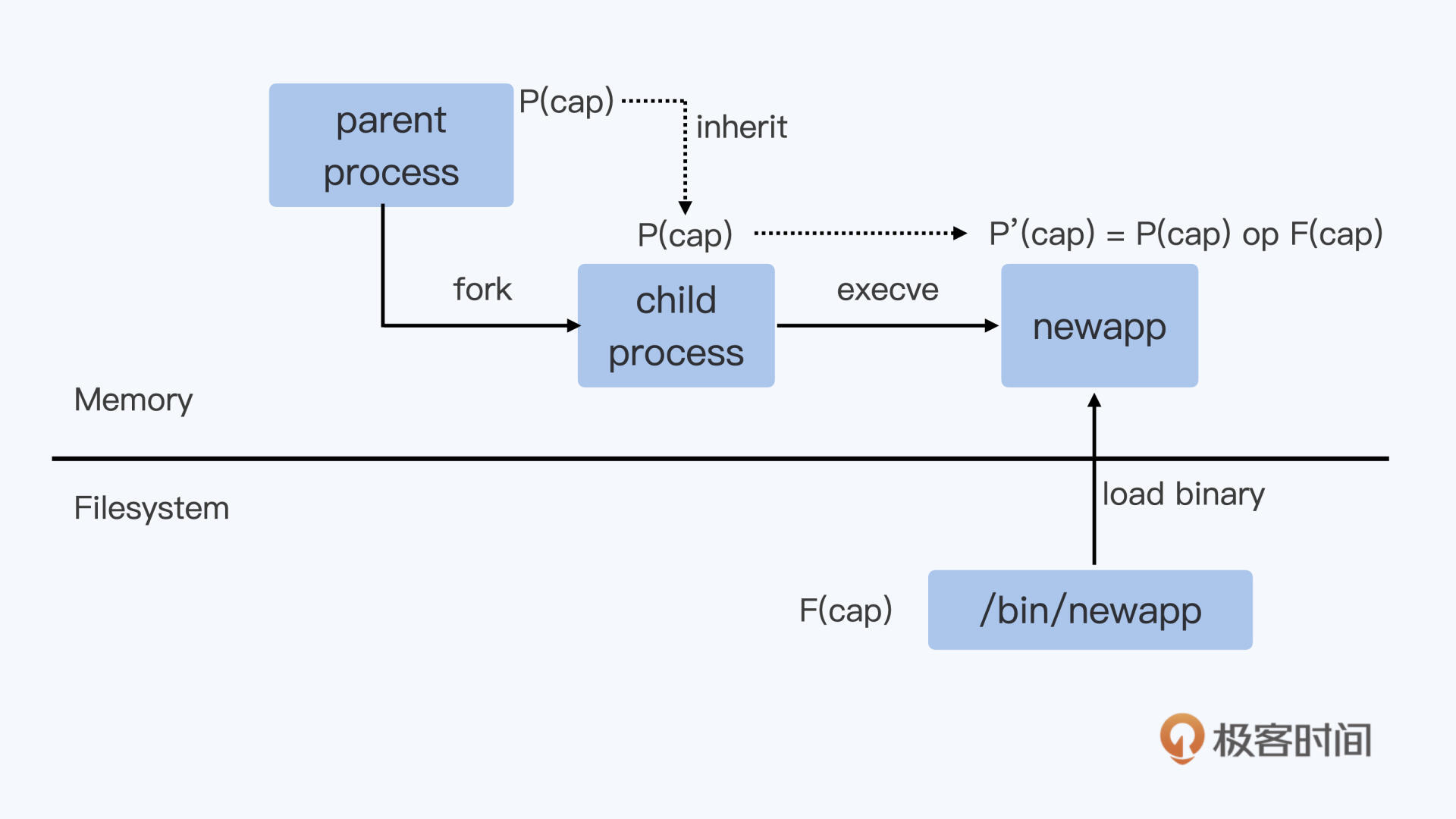就像图片所描绘的那样,这个新运行的进程里的相关capabilities参数的值,是由它的父进程以及程序文件中的capabilities参数值计算得来的。