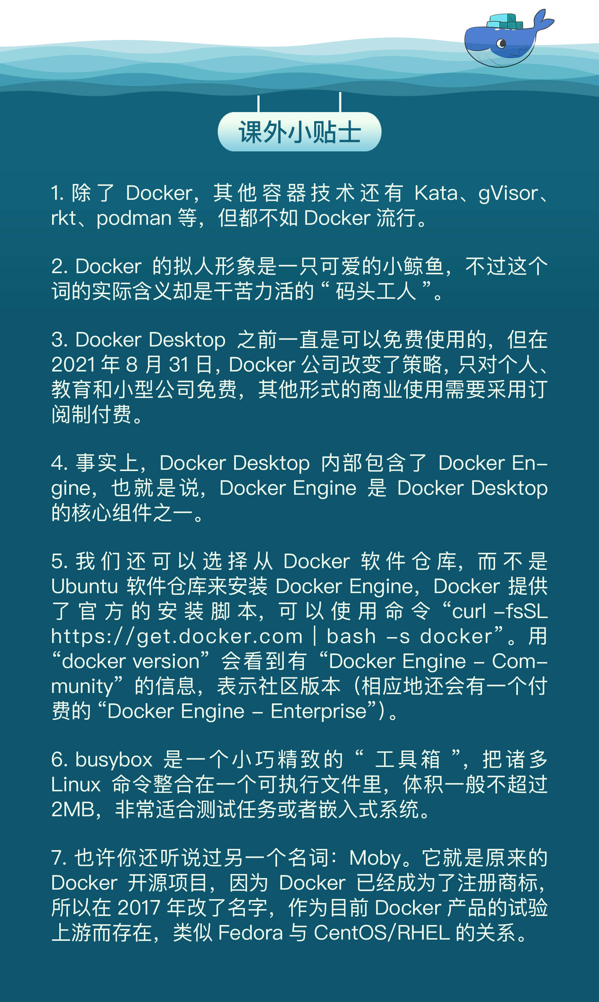 - 容器技术起源于Docker,它目前有两个产品:Docker Desktop和Docker Engine,我们的课程里推荐使用免费的Docker Engine,它可以在Ubuntu系统里直接用apt命令安装。