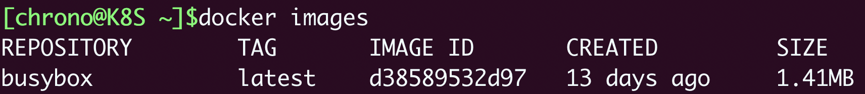 可以看到,命令会显示有一个叫busybox的镜像,镜像的ID号是一串16进制数字,大小是1.41MB。