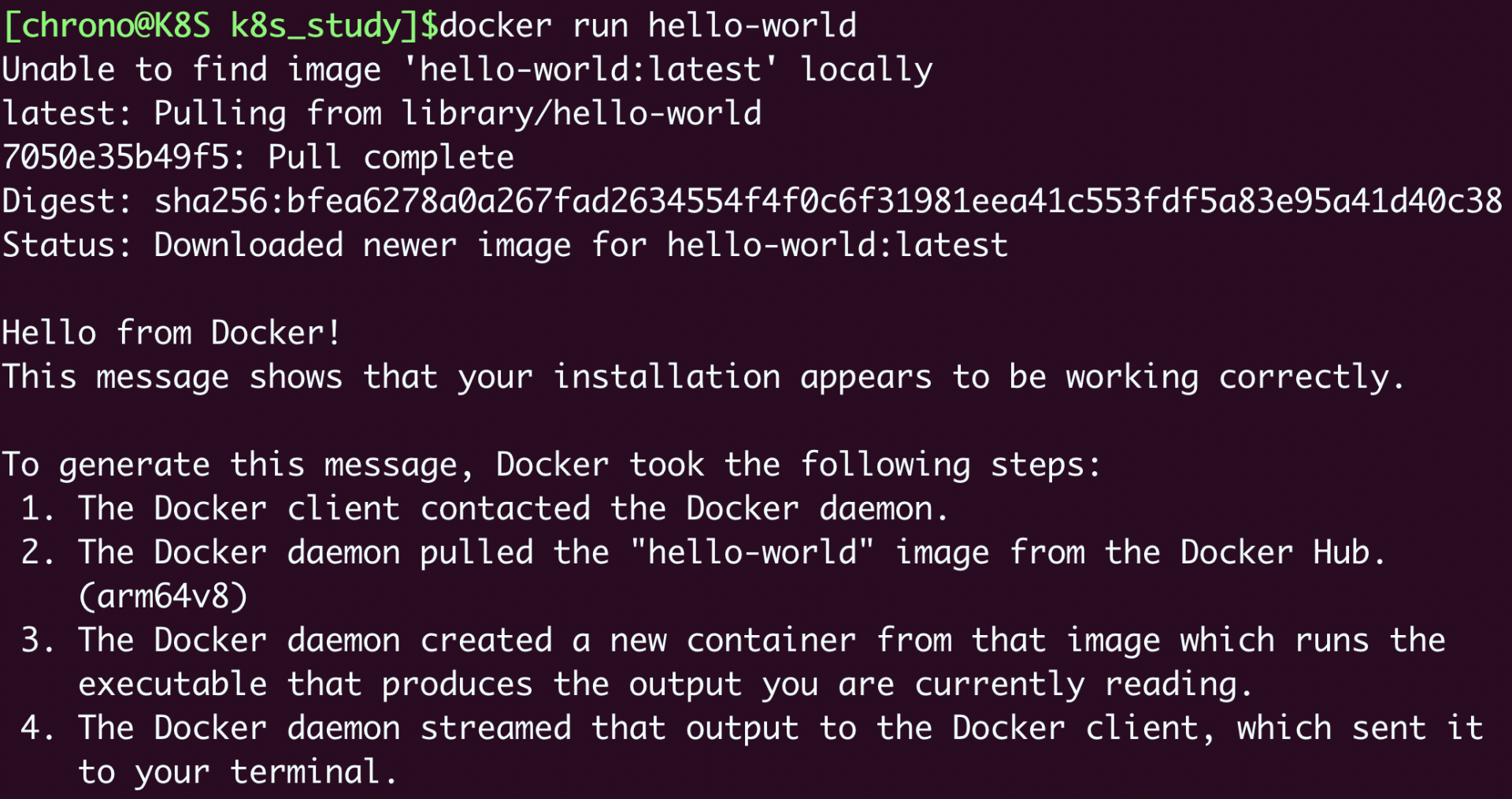 它会先检查本地镜像,如果没有就从远程仓库拉取,再运行容器,最后输出运行信息: