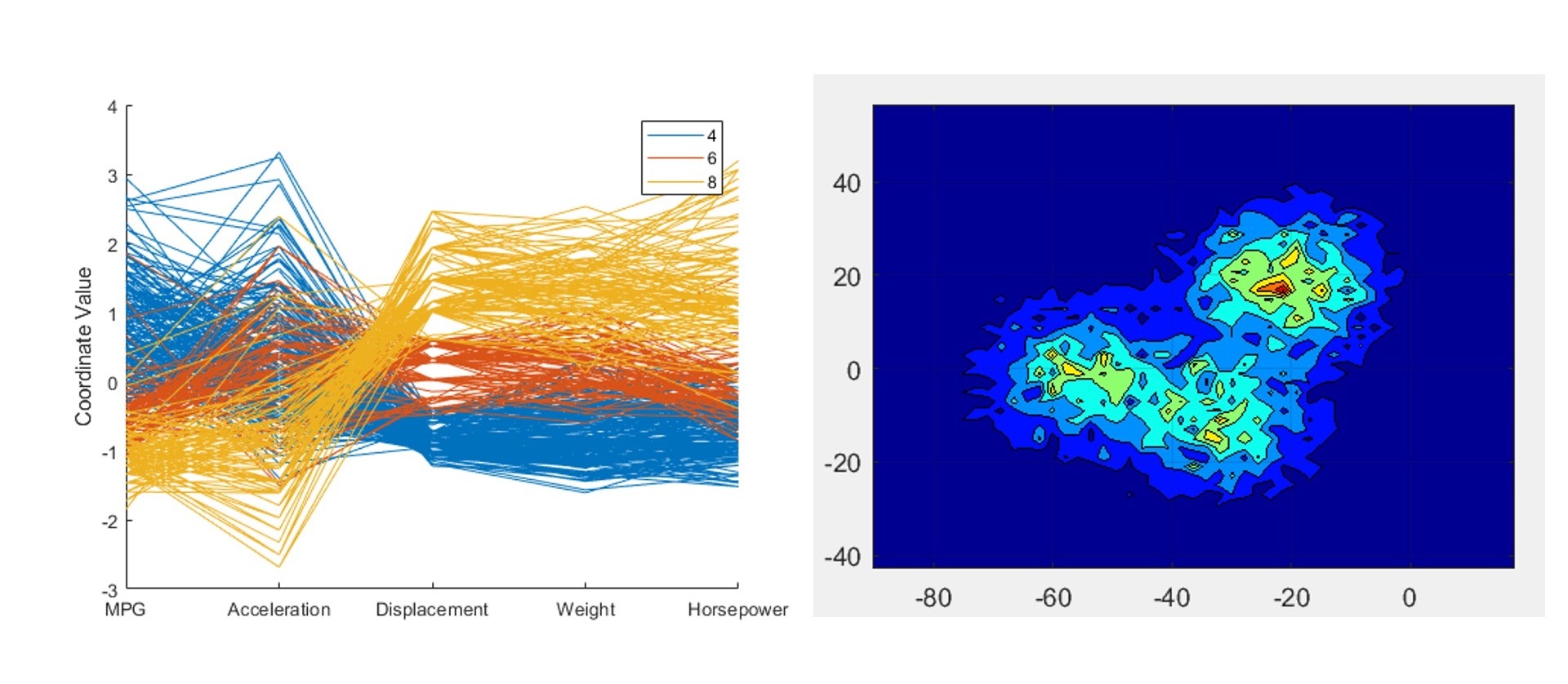 再比如,还有平行坐标图。平行坐标图也有横纵两个坐标轴,并且把要进行对比的五个不同参数都放在了水平方向的坐标上。在下面的示意图中,绘制了所有4缸、6缸或8缸汽车在五个不同参数(变量)上的对比。