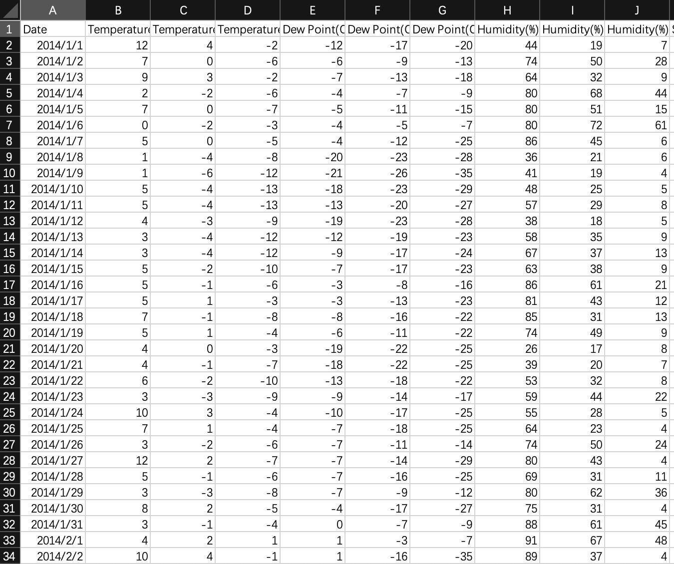 一般来说,我们拿到的原始数据通常可以组织成表格的形式,表格中会有很多列,每一列都代表一个变量。比如,我们拿到的这份天气历史数据,它看起来可能是下面这样的: