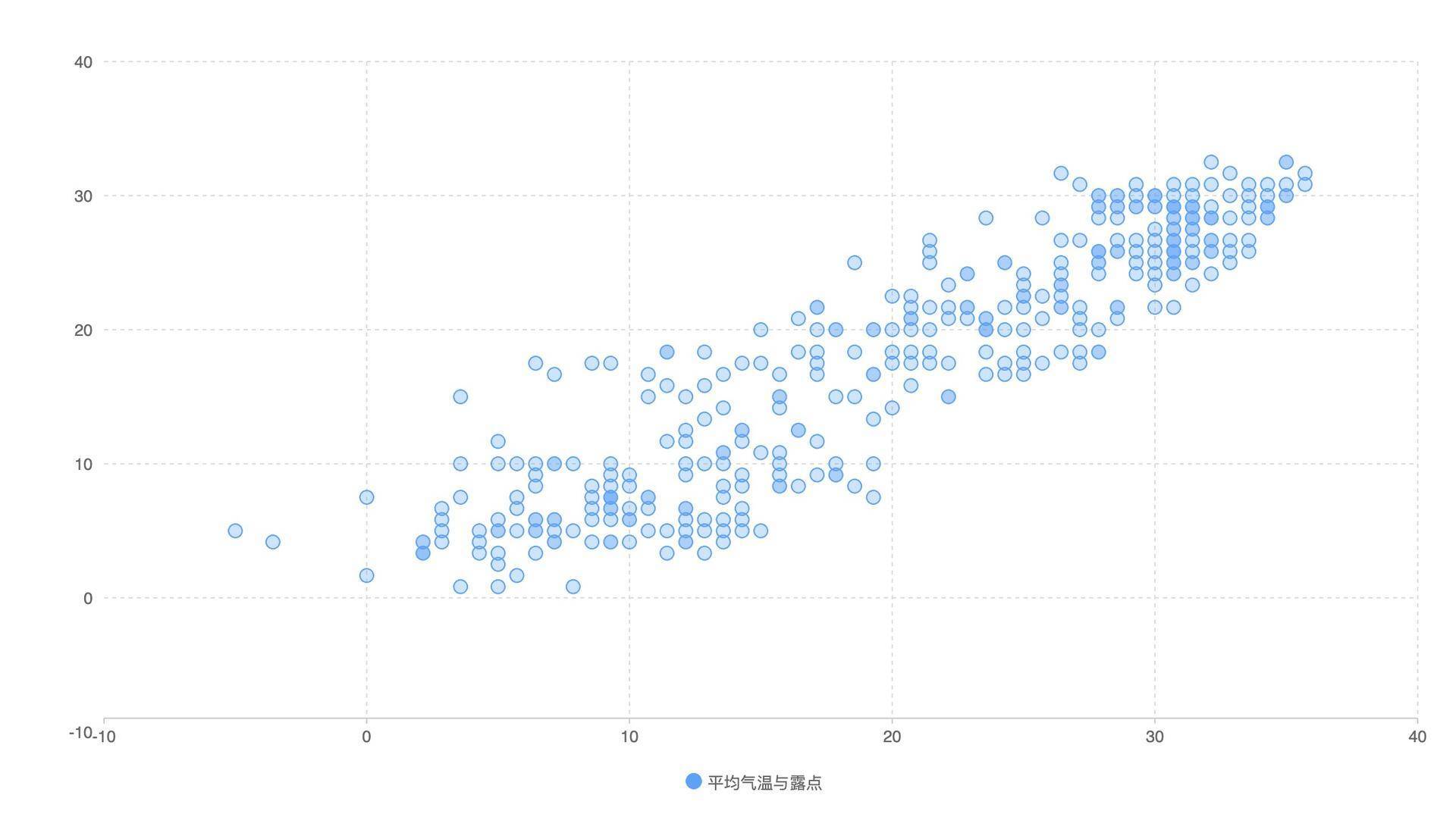 从定义里我们知道,露点和温度与湿度都有相关性。接下来,我们来看一下露点和温度的相关性在散点图中是怎么体现的。很简单,我们只要修改一下上面代码里的数据,把平均湿度换成平均露点温度就行了。