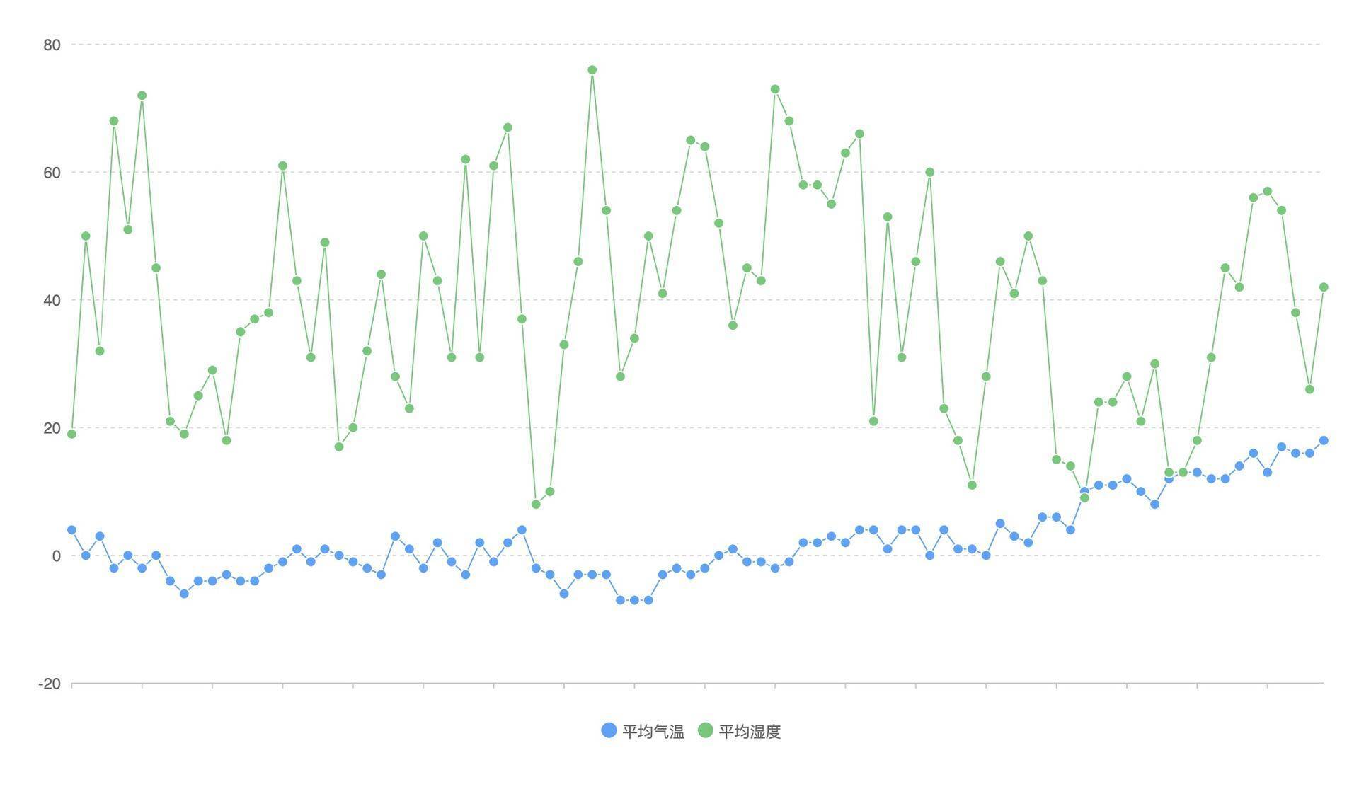 一般来说,要分析两个变量的相关性,我们可以使用散点图,散点图有两个坐标轴,其中一个坐标轴表示变量A,另一个坐标轴表示变量B。这里,我们将平均温度、相对湿度数据获取出来,然后用QCharts的散点图(Scatter)来渲染。具体的代码和示意图如下: