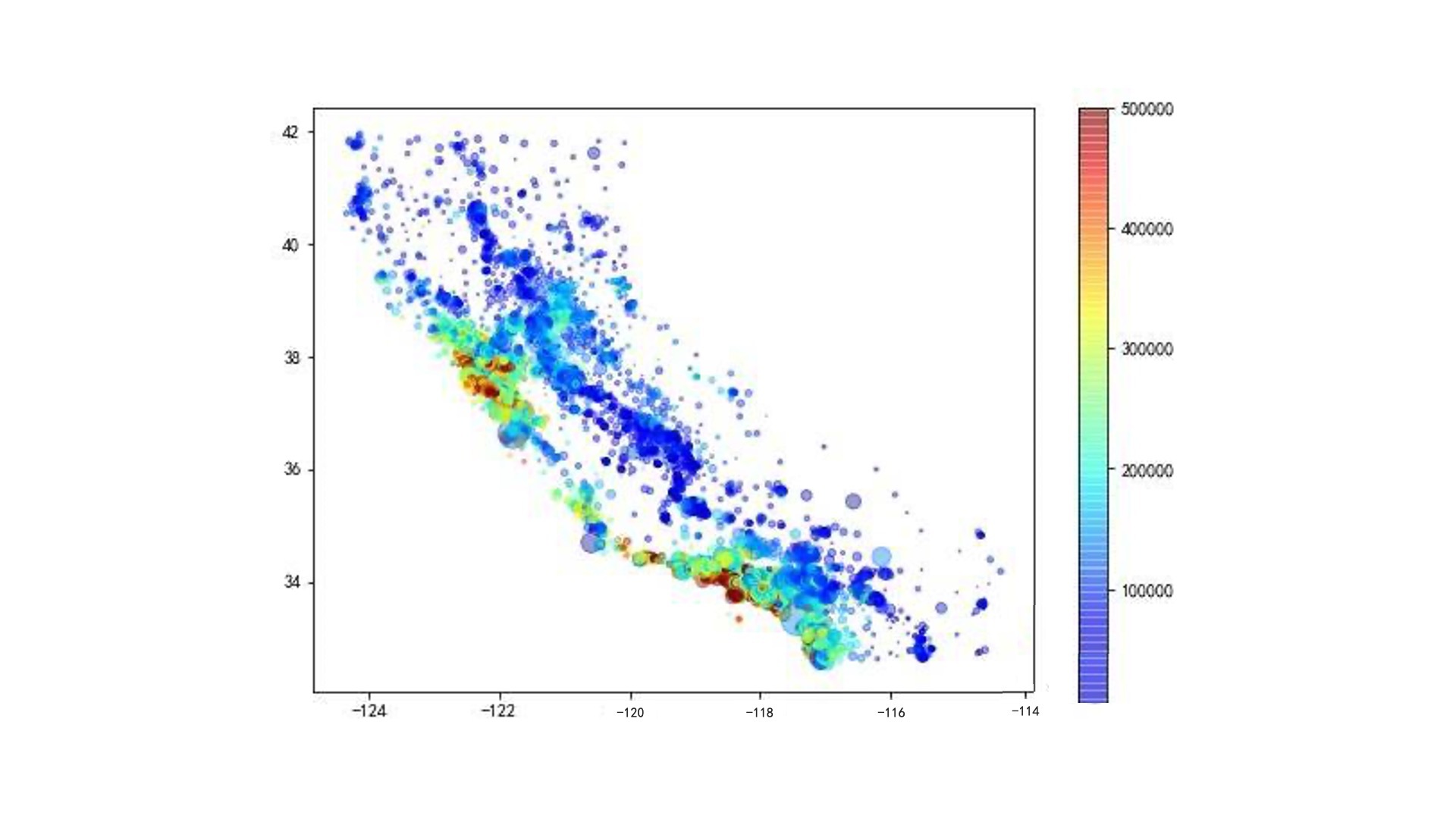 举个例子,我在下面给出了一张根据加州房产数据集制作的散点图。其中,点的大小代表街区人口数量、透明度代表人口密度,而颜色代表房价高低,并且加上经纬度代表点的位置。这个散点图一共表示了五维的变量(经度、纬度、人口总数、人口密度、房价高低),将它们都呈现在了一张图上,这在一定程度上表达了这些变量的相关信息。