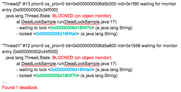 最后,结合代码分析线程栈信息。上面这个输出非常明显,找到处于BLOCKED状态的线程,按照试图获取(waiting)的锁ID(请看我标记为相同颜色的数字)查找,很快就定位问题。 jstack本身也会把类似的简单死锁抽取出来,直接打印出来。