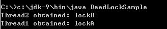 这个程序编译执行后,几乎每次都可以重现死锁,请看下面截取的输出。另外,这里有个比较有意思的地方,为什么我先调用Thread1的start,但是Thread2却先打印出来了呢?这就是因为线程调度依赖于(操作系统)调度器,虽然你可以通过优先级之类进行影响,但是具体情况是不确定的。