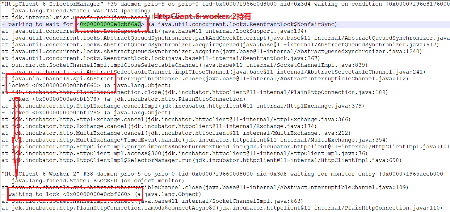 在close发生时, HttpClient-6-SelectorManager线程持有readLock/writeLock,试图获得closeLock;与此同时,另一个HttpClient-6-Worker-2线程,持有closeLock,试图获得readLock,这就不可避免地进入了死锁。