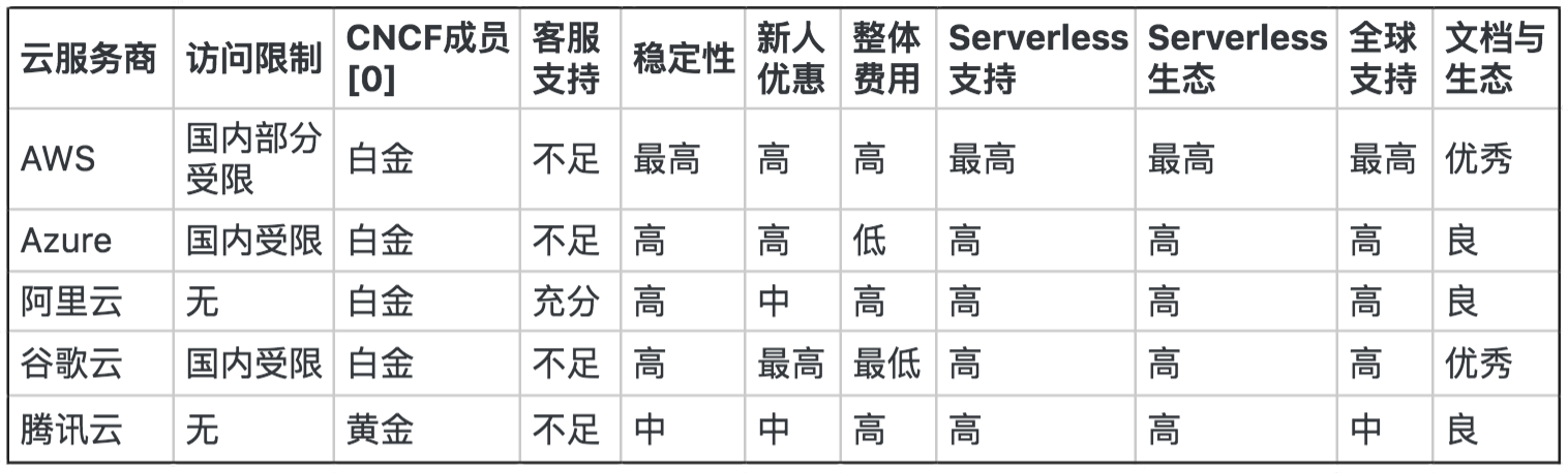下面是我按我目前(注意只是目前)掌握的数据和认知整理的表格,在选择云服务商时你可以作为参考。其中访问限制应该是最优先考虑的,国内运营部署的应用,肯定是要首选国内云服务商。