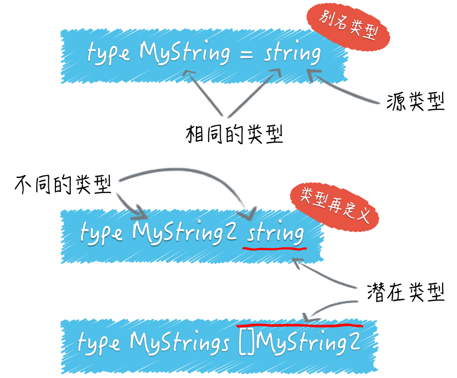源类型与别名类型是一对概念,是两个对立的称呼。别名类型主要是为了代码重构而存在的。更详细的信息可参见Go语言官方的文档Proposal: Type Aliases。