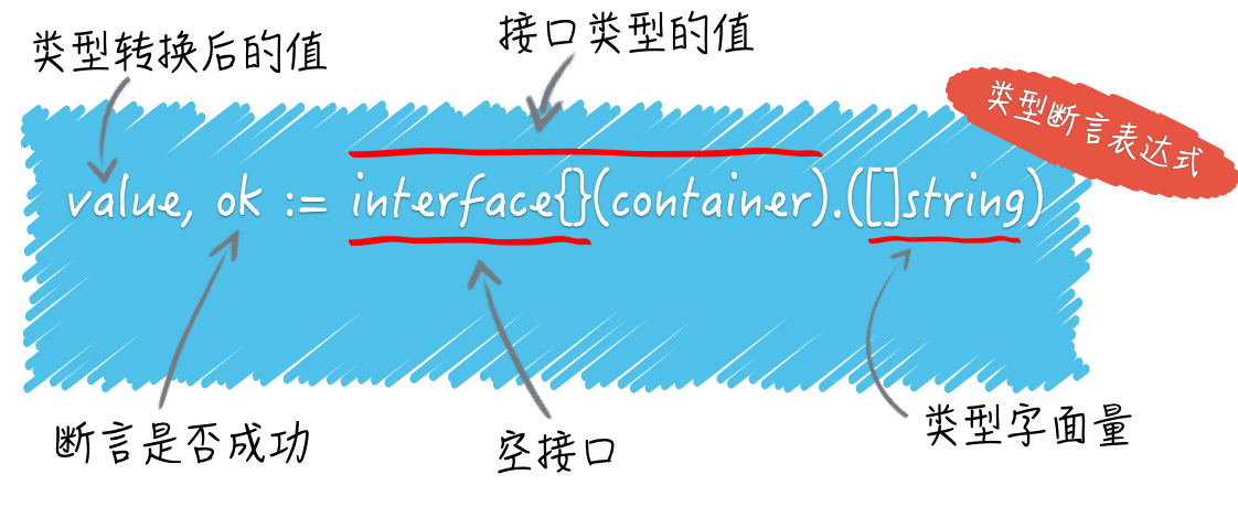 如果container是某个接口类型的,那么这个类型断言表达式就可以是container.([]string)。这样看是不是清晰一些了?
