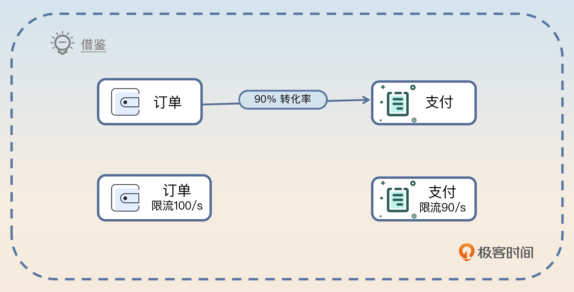 不过如果真的做不了,或者来不及,或者没资源,那么还可以考虑参考类似服务的阈值。比如说如果A、B服务是紧密相关的,也就是通常调用了A服务就会调用B服务,那么可以用 A 已经确定的阈值作为 B 的阈值。又或者 A 服务到 B 服务之间有一个转化关系。比如说创建订单到支付,会有一个转化率,假如说是 90%,如果创建订单的接口阈值是 100,那么支付的接口就可以设置为 90。