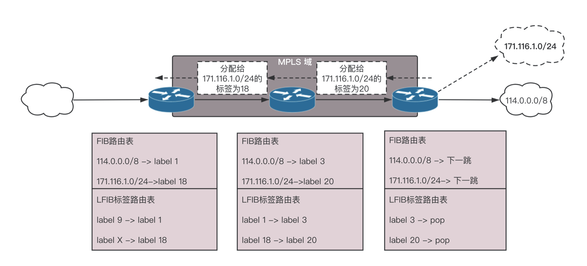 例如图中要访问114.1.1.1,在边界上查找普通路由,发现马上要进入MPLS区域了,进去了对应标签1,于是在IP头外面加一个标签1,在区域里面,标签1要变成标签3,标签3到达出口边缘,将标签去掉,按照路由发出。