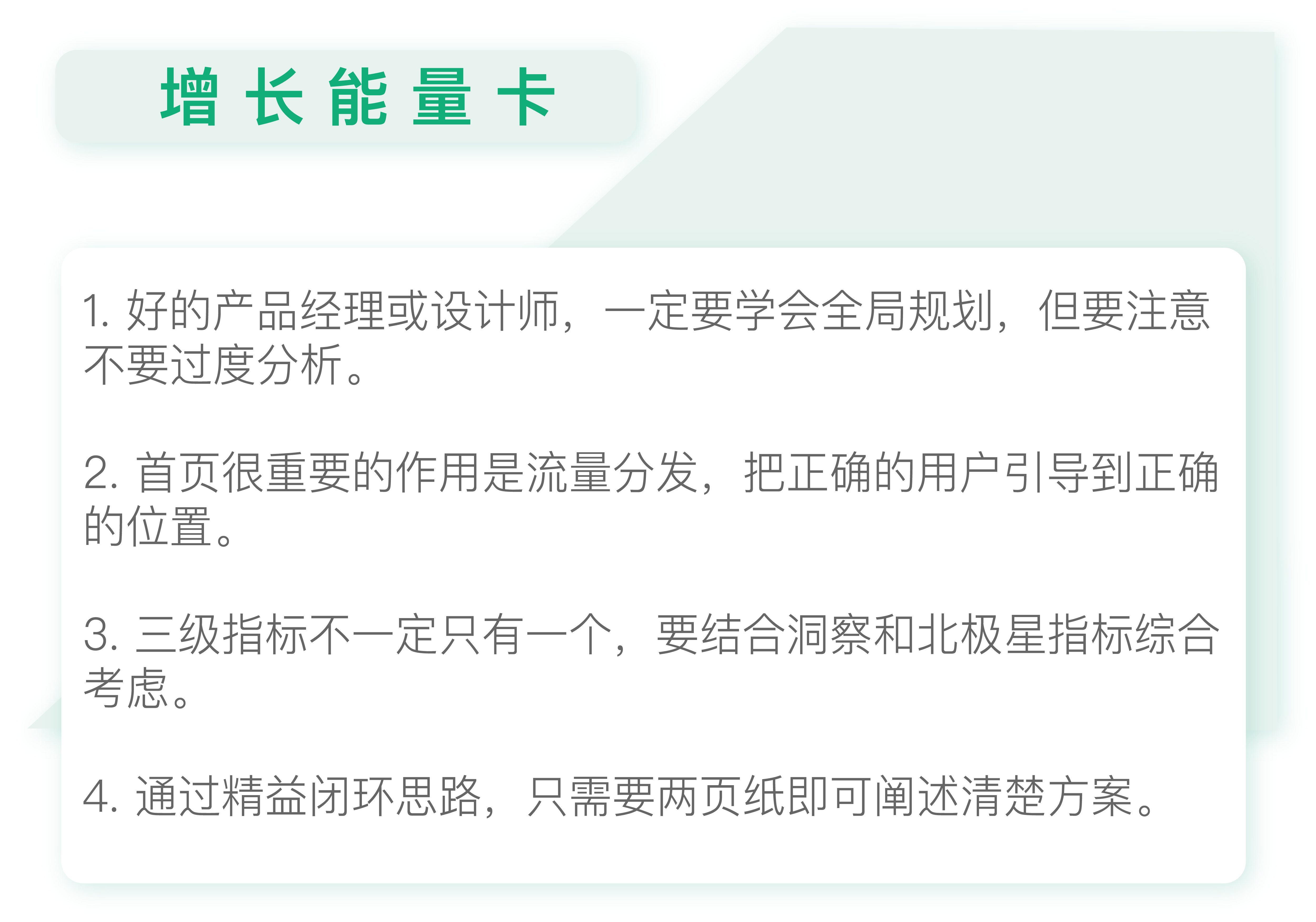 右边是辅助说明,比如每个具体的假设和对应的分解是什么,如何体现在界面中。这样我们通过精益闭环思路和方案阐述这两页纸,就可以非常清楚的阐述整体设计方案,并且保证和业务方站在同一个频道上对话。这种方式完胜过去的百页PPT或者不经大脑的“补洞”行为。