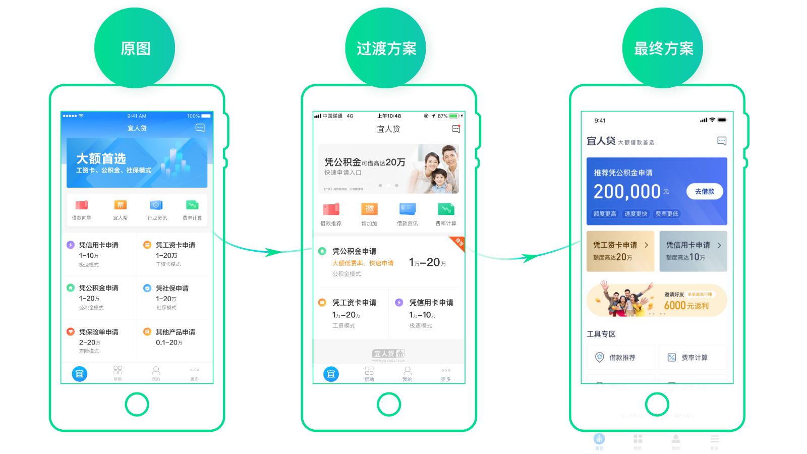 从图中你可以看到,借款区替代了原来banner的位置,放在了最显眼的地方,颜色十分突出,衬托出大大的数字“200000”,展现了我们的高额度。banner和工具区则被放在了下面的位置上。当然,这个方案还有一些其它的小细节。比如最上方有“宜人贷,大额借款首选”字样,突出产品定位等等。