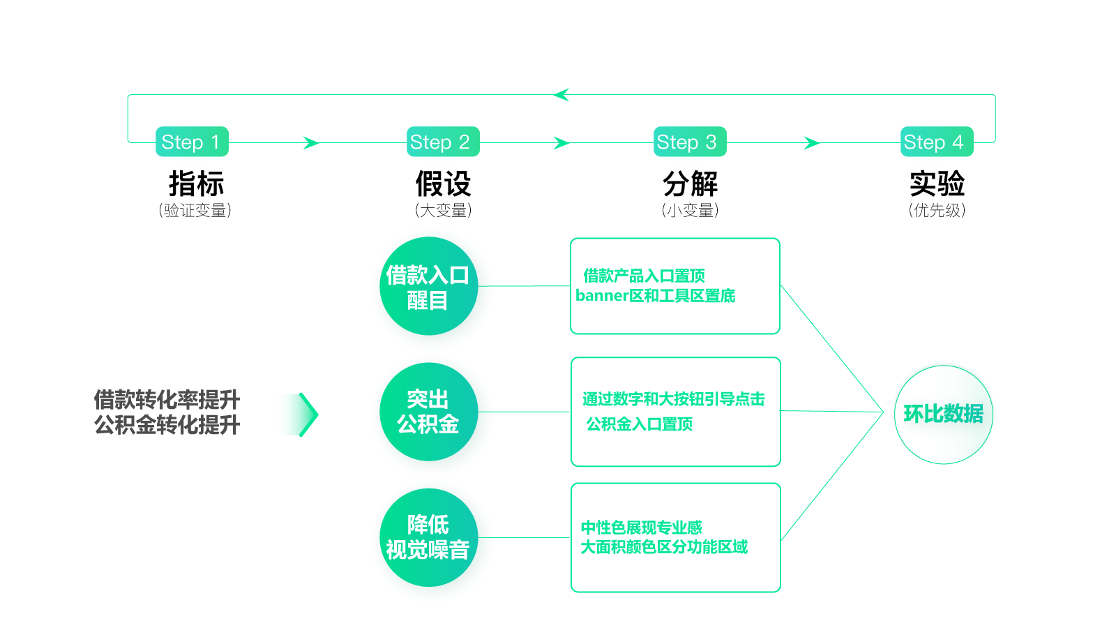 因为指标是“借款转化率提升,公积金点击提升”,而其中公积金转化提升更加重要。所以,对应的假设就很容易得出了,分别是“借款入口醒目”“突出公积金”“降低视觉噪音”。