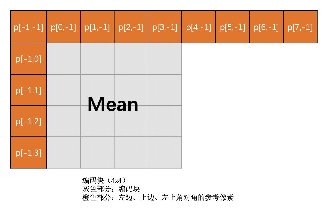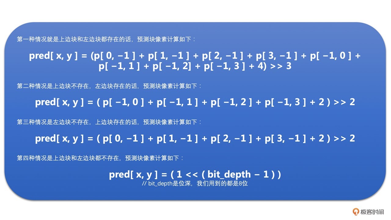 根据上边块和左边块是不是存在,该模式下预测块像素的计算方法分为以下四种情况: