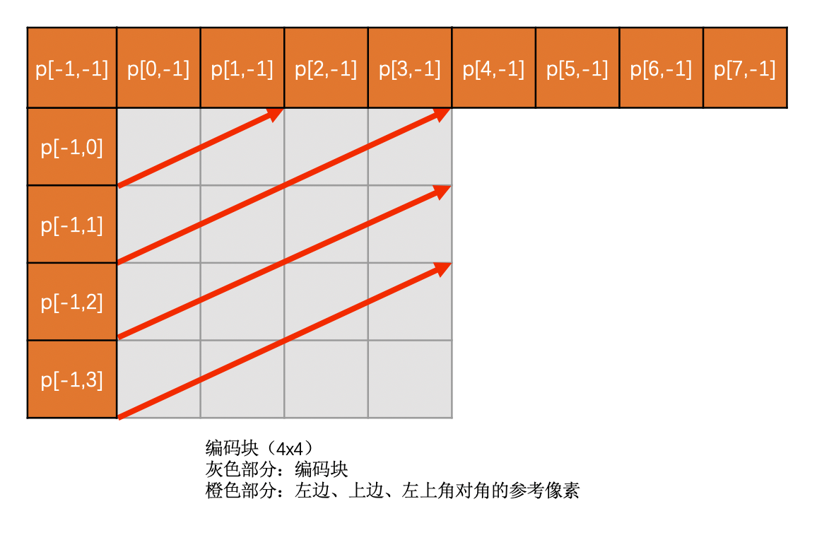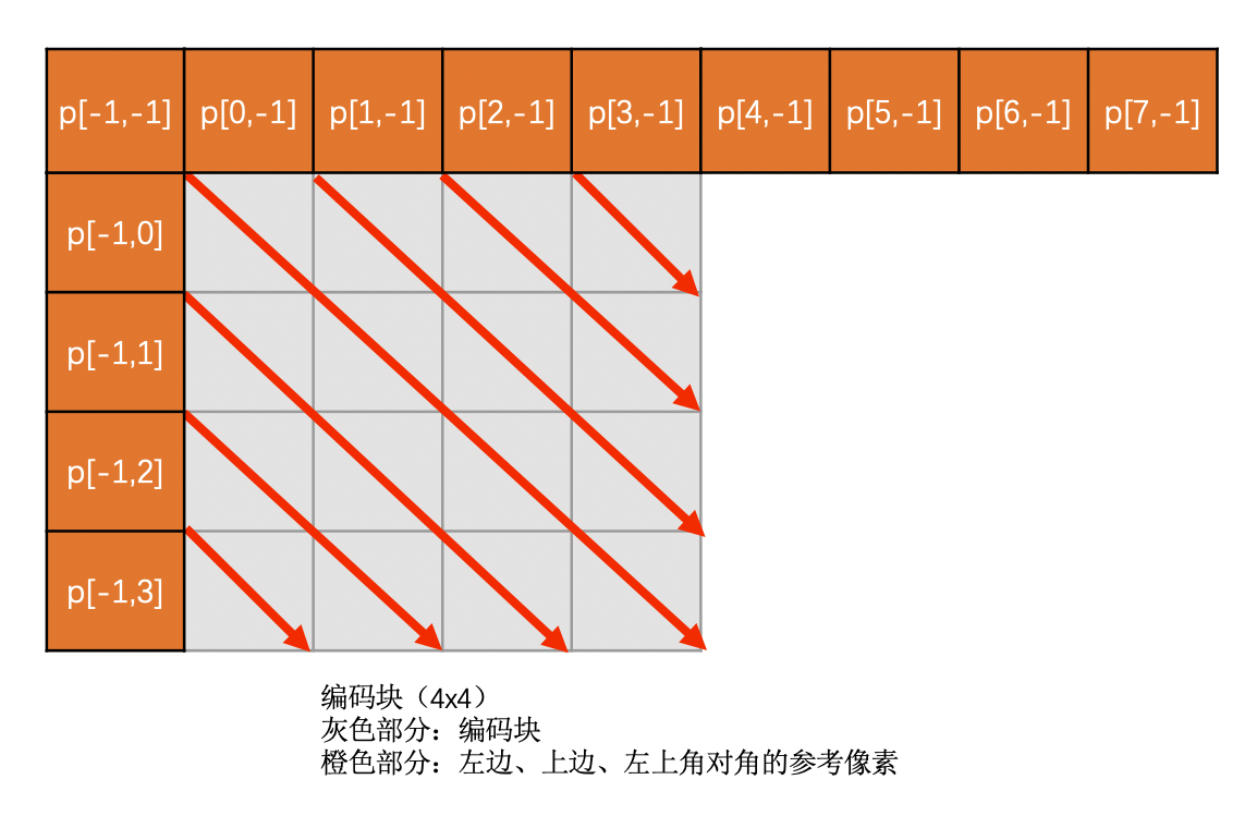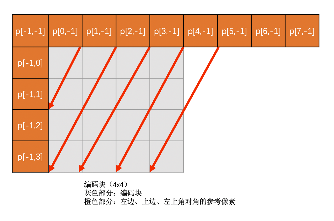 Vertical-Right模式是需要通过上边块、左边块以及左上角对角的像素插值得到的。必须要这三个都有效才能使用,否则该模式无效。