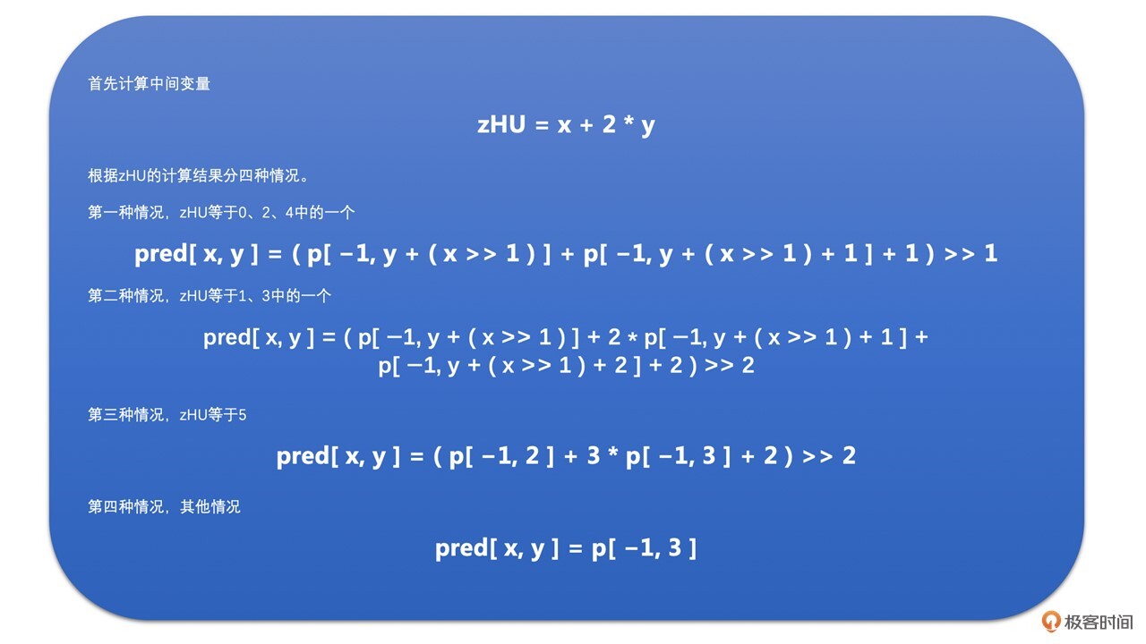 接下来我们介绍一下Plane模式。这种模式相比前面三种模式稍微复杂一些,但是基本原理都差不多。Plane预测块的每一个像素值,都是将上边已编码块的最下面那一行,和左边已编码块右边最后一列的像素值经过下面公式计算得到的。
