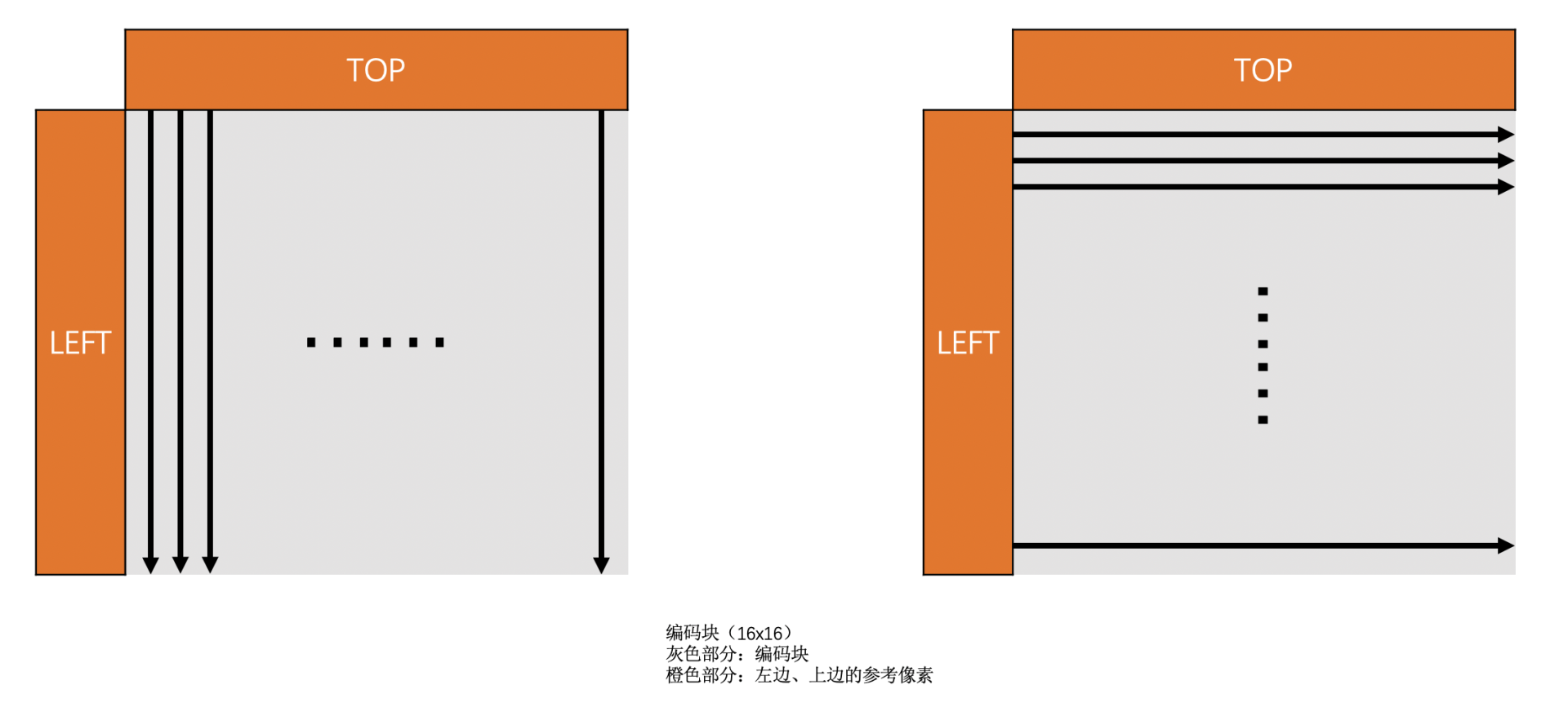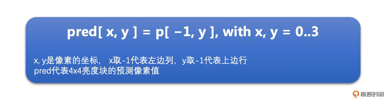 这里需要注意的一个点就是,我们是通过已经编码了的像素值去预测待编码的像素值。你可能会问,已经编码了的像素值变成码流了,不再是一个个像素了,怎么去预测待编码的像素呢?其实已经编码了的像素是会重建成重建像素,用来做之后待编码块的参考像素的。你可以认为是已经编码的块会解码成像素用来做参考像素。