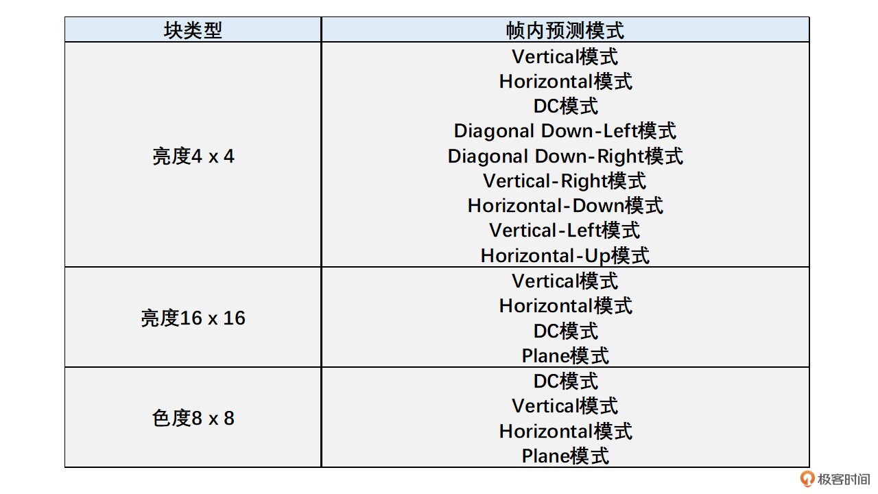 为了方便你记忆,下面我把每一种块和子块支持的预测模式用一个表格来总结一下。