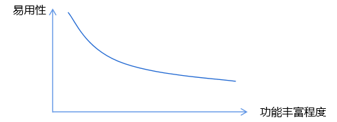 根据前面我们说到的传统低代码编辑器的易用性和功能丰富程度(即复杂度),大概定性地呈下面这样的关系。