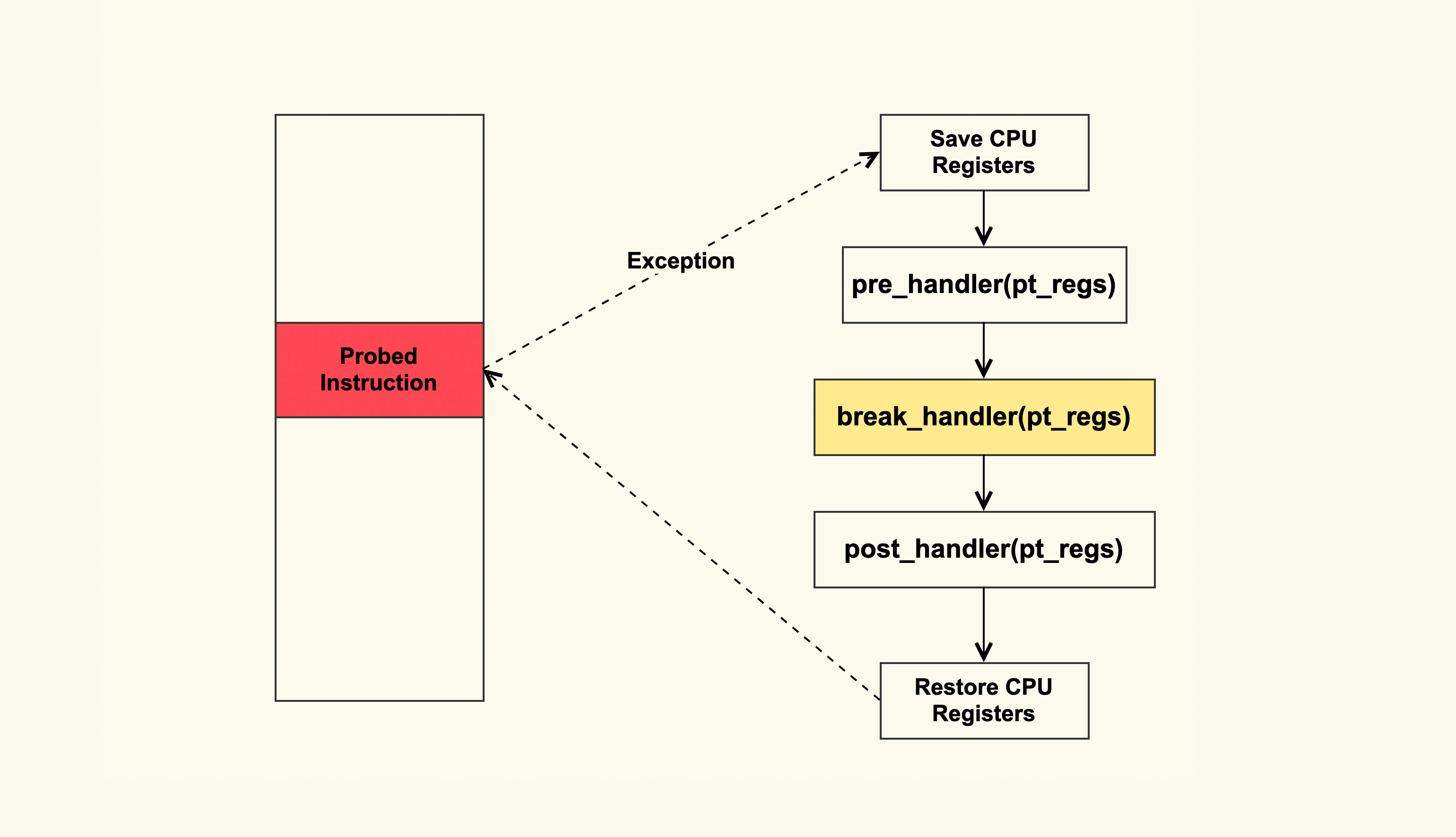 追踪内核函数最通用的方法是使用Kprobe,Kprobe的大致原理如下: