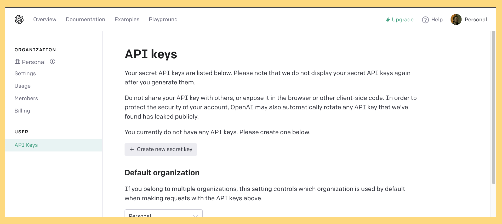 对应的API Key你需要把它存储在一个安全的地方,后面我们调用OpenAI的接口都需要使用这个API Key。