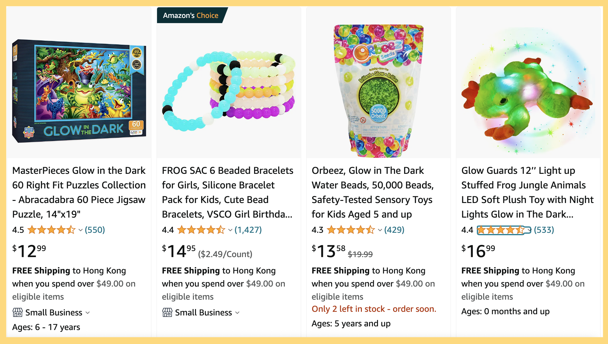 第三个是利用AI自己有的知识给商品定价,这里它为这个商品定的价格是在10~20美元之间。而我用 “Glow-in-the-Dark frog” 在亚马逊里搜索,搜索结果的第一行里,就有一个16美元发光的青蛙。